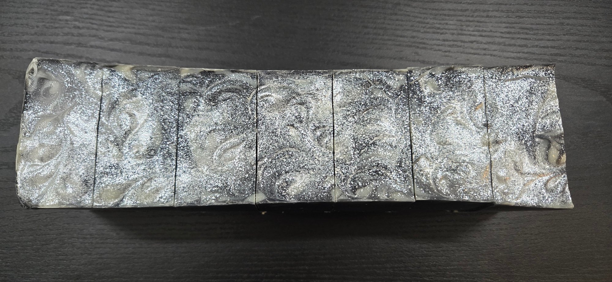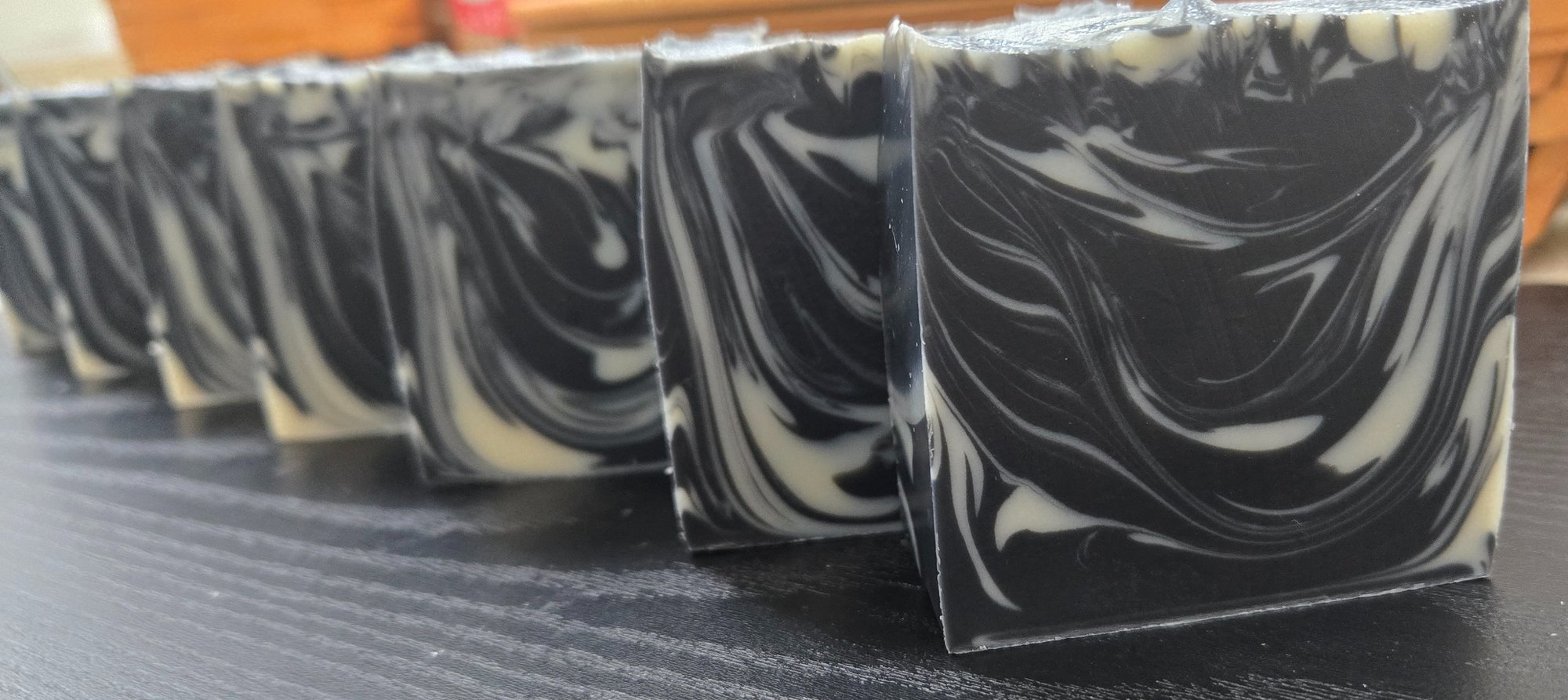 Ingredients: coconut oil, olive oil, distilled water, sodium hydroxide, sodium lactate, kaolin clay, colloidal oats, pure cane sugar, tussah silk, fragrance, activated coconut charcoal & mica